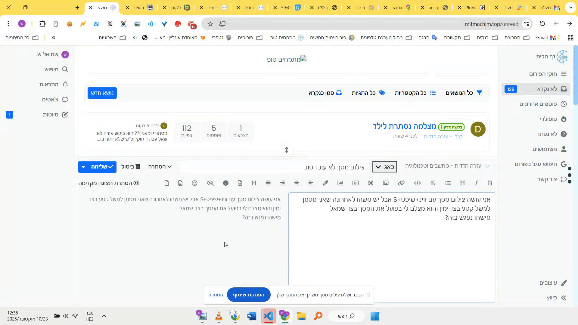 @שמואל-ש. אני לא יודע מה הפתרון לבעייה הספציפית, מסתבר בעיות דרייברים, אבל רציתי להציע תוסף צילום מסך, הוא מאוד נח ועובד גם במקרי חסימת צילום, הנה הקישור. Lightshot