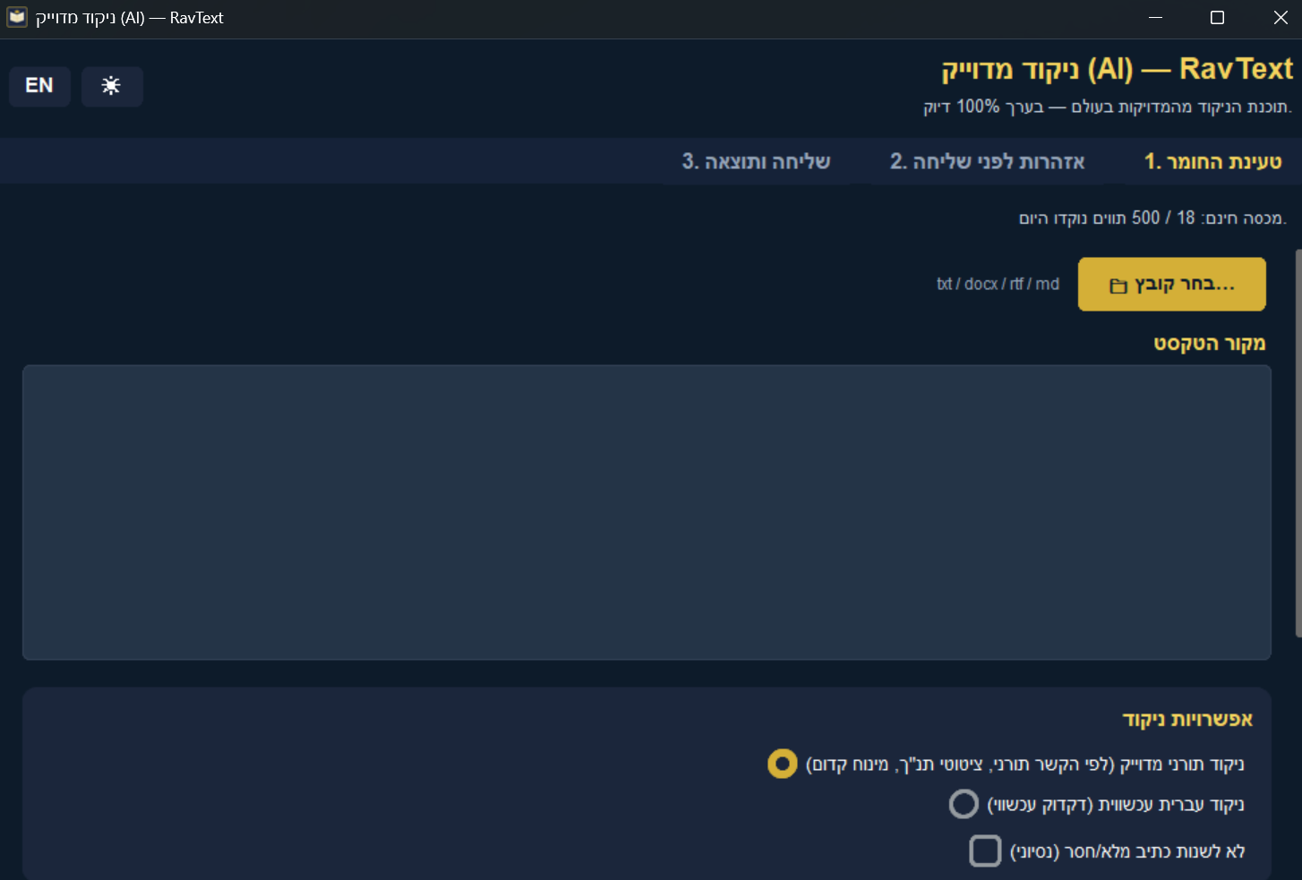 הוראות ניקוד בתוכנה: הדבקת טקסט או פתיחת קובץ [image: 1777453638895-41ce5f32-ff8f-4802-a9dd-7ea3d31176e7-image.png] בדיקת הגדרות דיין (אם תבחרו דיין, נ.ב. ה'מומלץ' יוסר זה הבוט הכניס לפי הבנתו..) [image: 1777453665862-3f9ea9ef-fa41-46ca-a7ed-f09944f55310-image.png] אישור האזהרות ושליחה [image: 1777453695401-86d78ce0-7906-4a28-92cd-84c0d10d73d3-image.png] תוך כדי עבודה ניתן לצפות כבר בעד נוסח 1 מיד כשהוא נוצר [image: 1777453905820-78bfd257-e121-47e1-87af-74737c3ca7f2-image.png] [image: 1777454073817-5ca9a187-8e0e-491e-9206-69dcf7feda1c-image.png] לאחר הניקוד ניתן להשתמש בכלי הזה שנמצא בתוכנה שלי הנ"ל לבדיקה שלא היו הזיות. [image: 1777451752992-eeaff1bd-81a8-48ff-842d-f29082197534-image-resized.png] יתכן שבהמשך נוכל להוסיף עוד אופציה לשליחת חומר אינסופי בפעם אחת והתוכנה תפצל אותו לחלקים קטנים שתשלח כל חלק בנפרד ותאחד אותם כדי לשמור על איכות העבודה בחלקים קטנים.