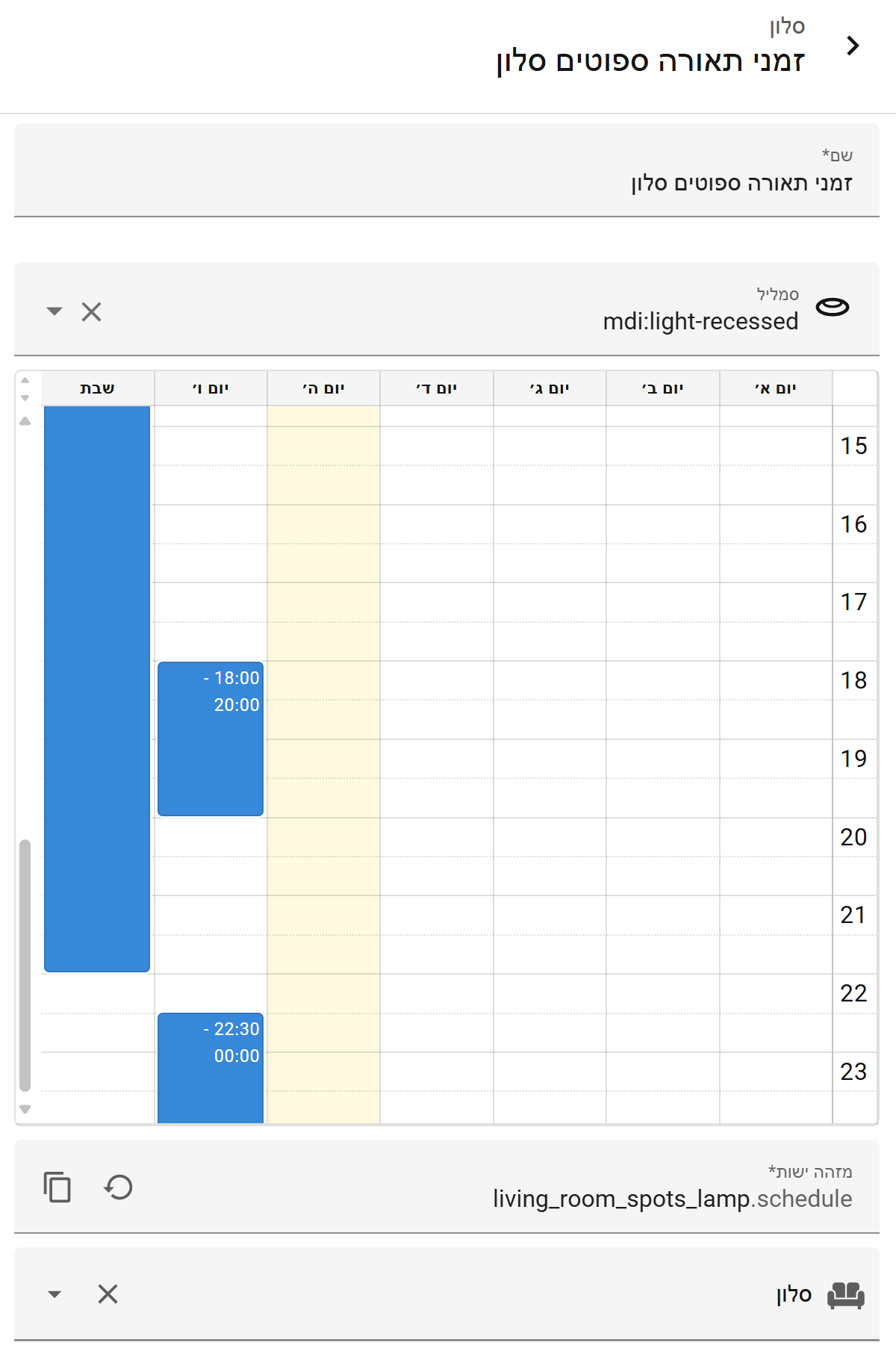 כדי לשלוט בזמני הפעלה של תאורה / מזגנים בבית לפי לוח זמנים מוגדר מראש (כמו בשעון שבת) יש לגשת ל-הגדרות > התקנים ושירותים > מסייעים > יצירת מסייע > לוח זמנים.