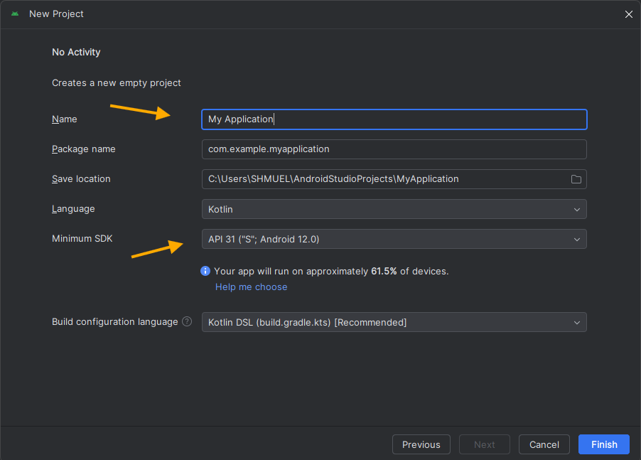 לאחר מכן יש לבחור שם לאפליקצייה (באנגלית) ואת גירסת האנדרואיד המנינלית שאליה היא מכוונת
