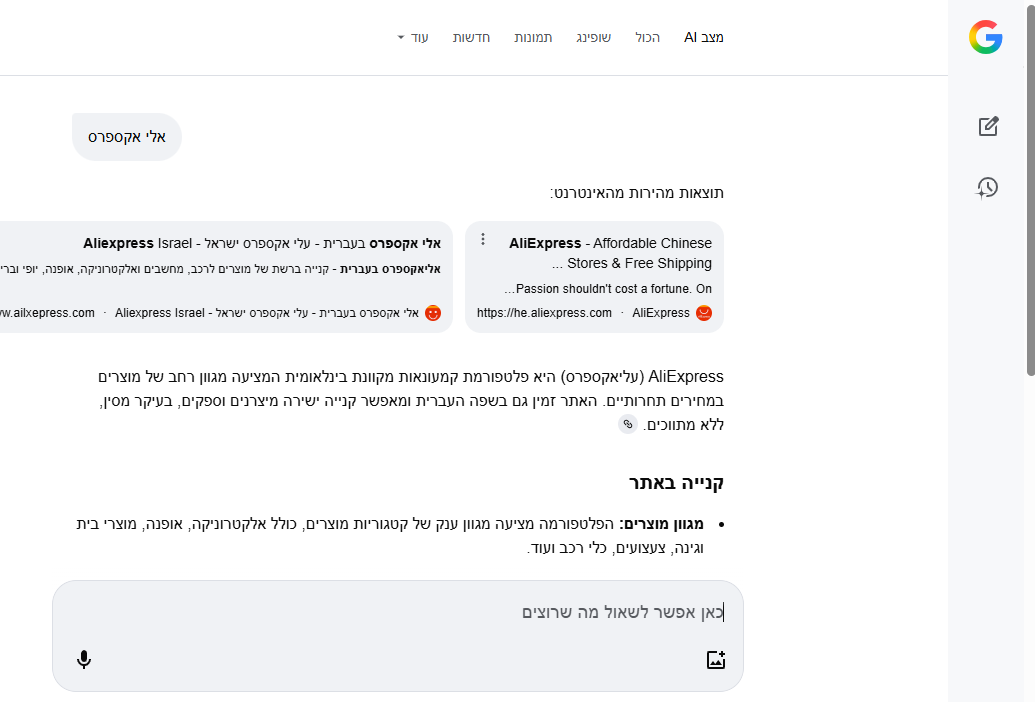 בסרגל מתחת לטקסט החיפוש יש אפשרויות כמו הכל,תמונות ,סרטונים, שופינג , ועכשו חדש מצב ai (בינה מלכותית) המצב מחפש בגוגל באמצעות גוגל גימיני ואף מאפשר לך להתכתב בנושא החיפושחסום בנטפרי...