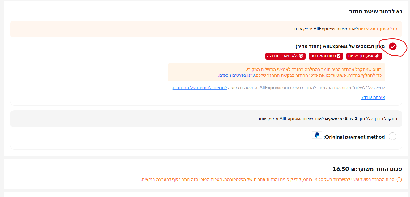 עכשיו יש לכם אופציה לבחור בהחזר לבונוס בעלי או בהחזר לאמצעי התשלום המקורי.
