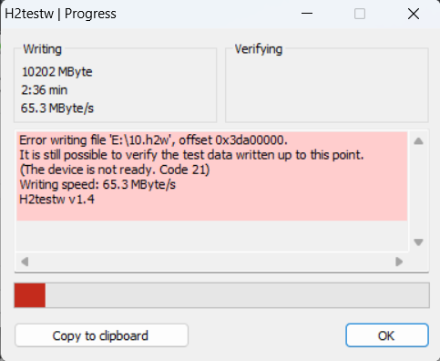 ויש מצב שבו התוכנה נתקלה בכשל בכתיבה ולא הצליחה בכלל לסיים את הבדיקה, נניח ככה
