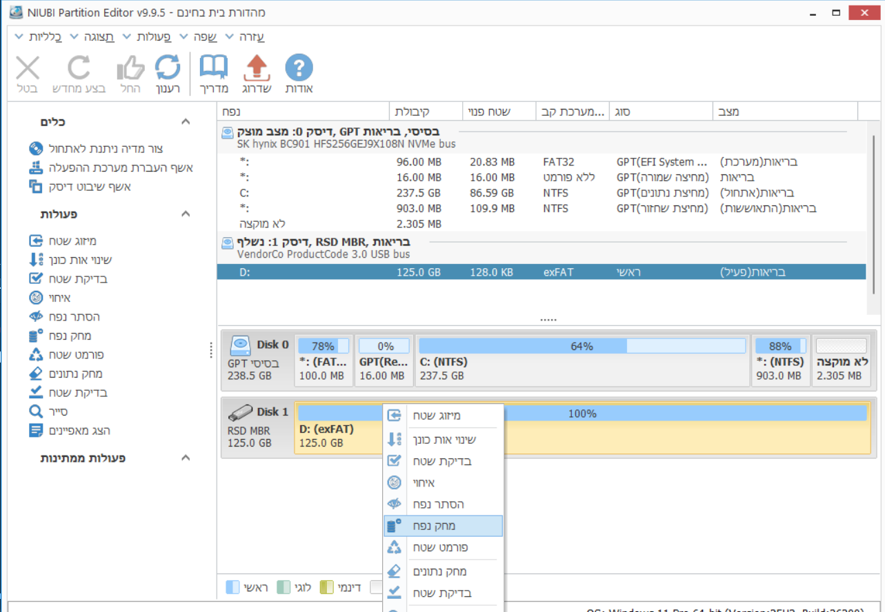 נפתח את התוכנה, נמצא את הדיסק ונבחר ב "מחק נפח"