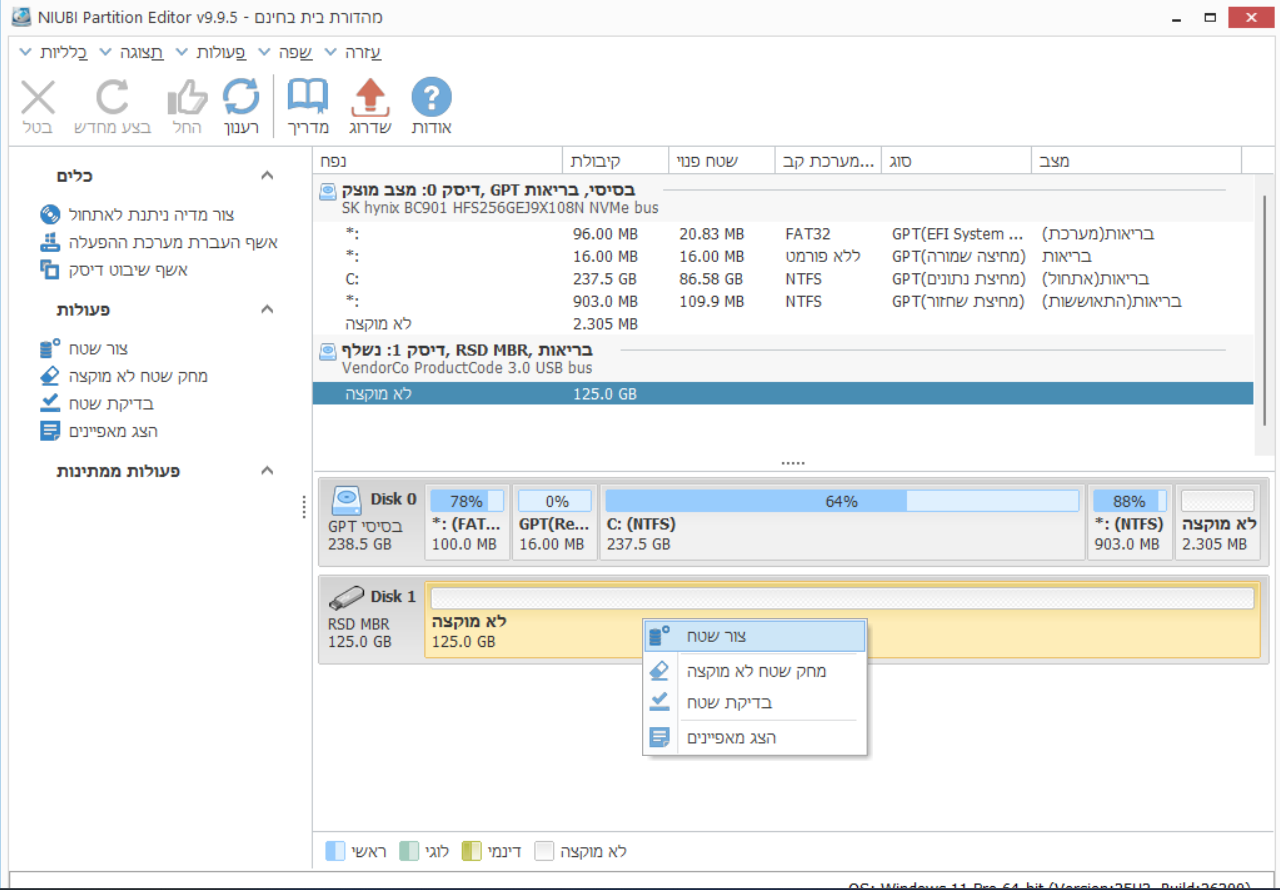לאחר מכן נלחץ על הדיסק ונבחר "צור שטח"