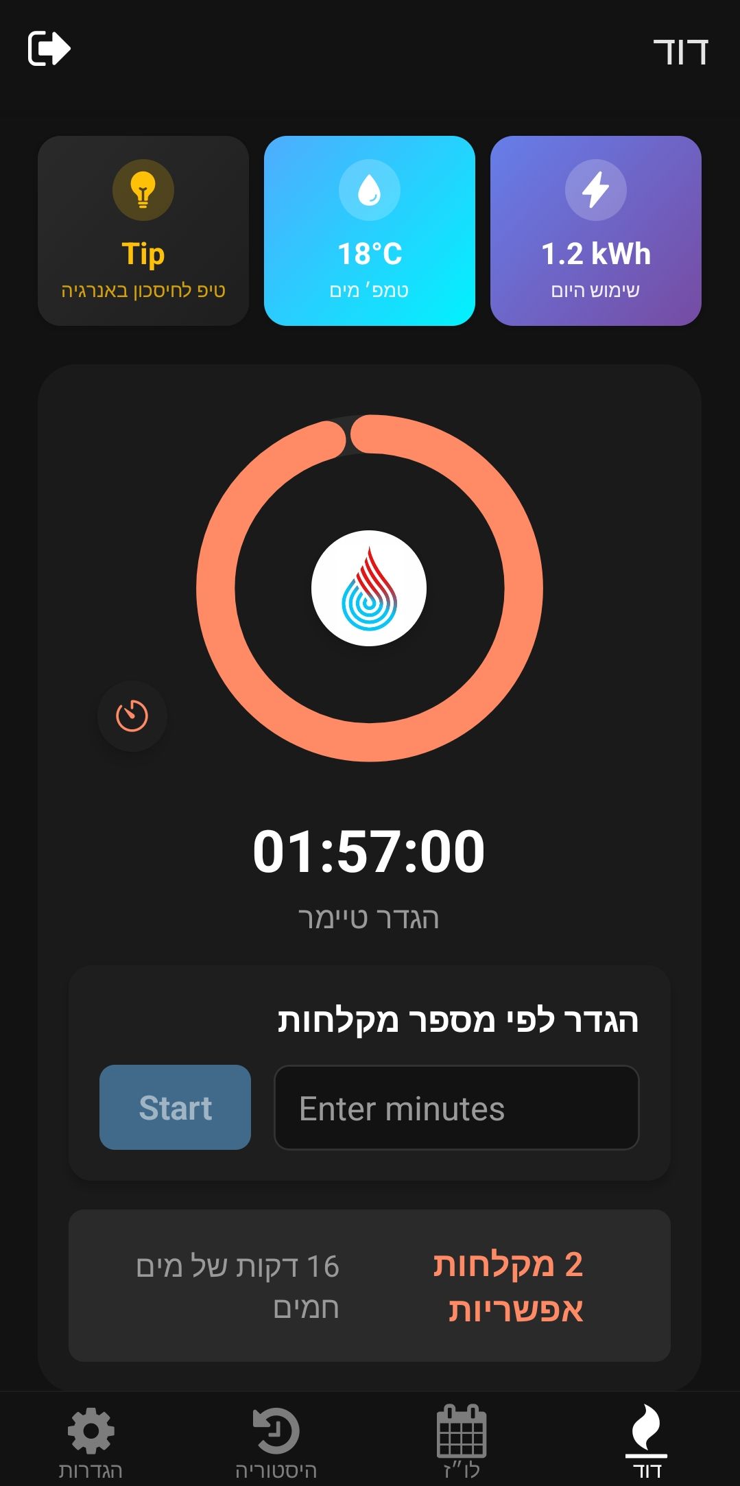 שלום לכולם, שמי עדי ואני מפתח מיזם טכנולוגי בשם Warm Time. המטרה היא לפתור את הבעיה המוכרת של 'נגמרו המים באמצע המקלחת' או להדליק דוד שעות לחינם. **המערכת שלנו מראה באפליקציה בדיוק כמה דקות מים חמים נשארו בדוד ומפעילה אותו רק לכמות הזמן שצריך.(לגבי נראות האפליקציה קיים גם בגוון לבן)