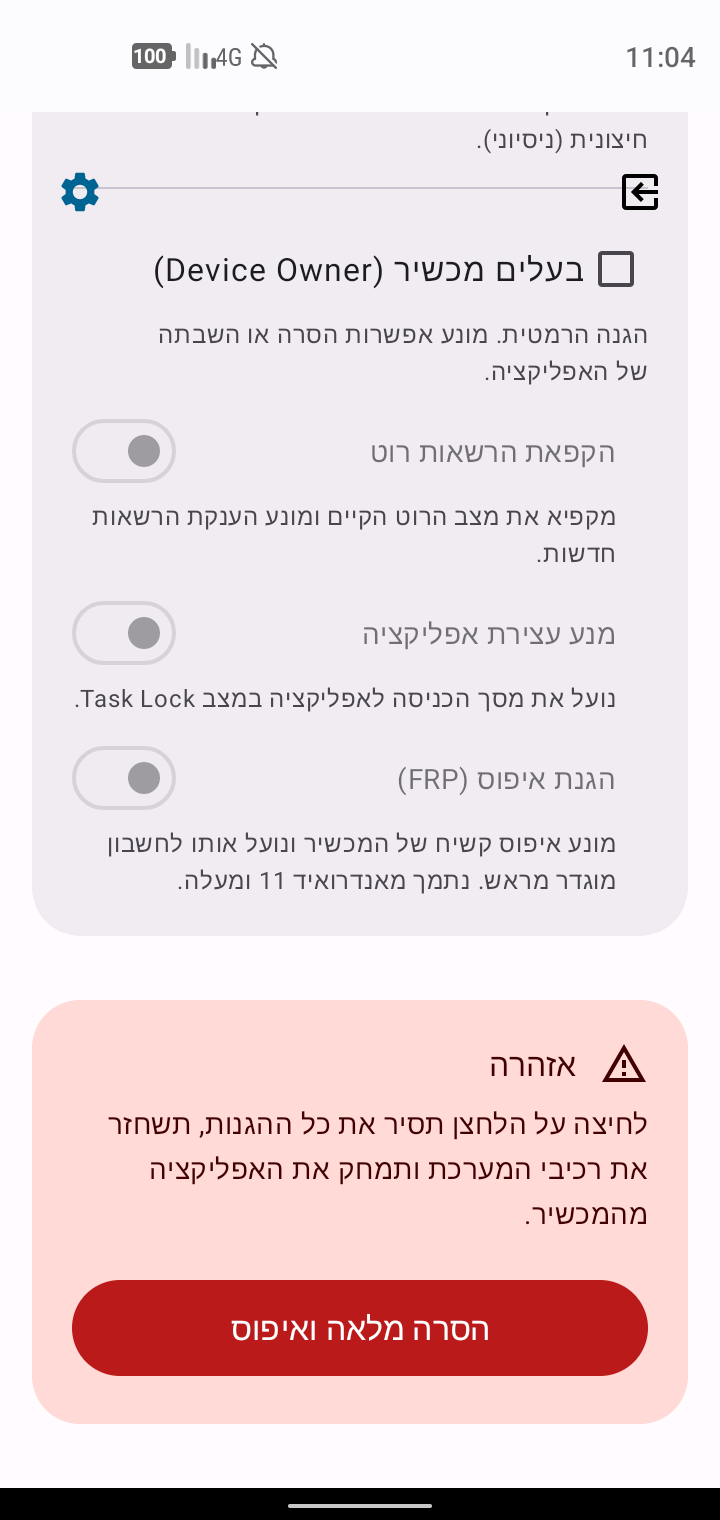 - מפעיל הגנה בסיסית ללא הגנת הסרה והשבתה. *מיועד למי שמעוניין לשלב עם אפליקציית mdm חיצונית.
