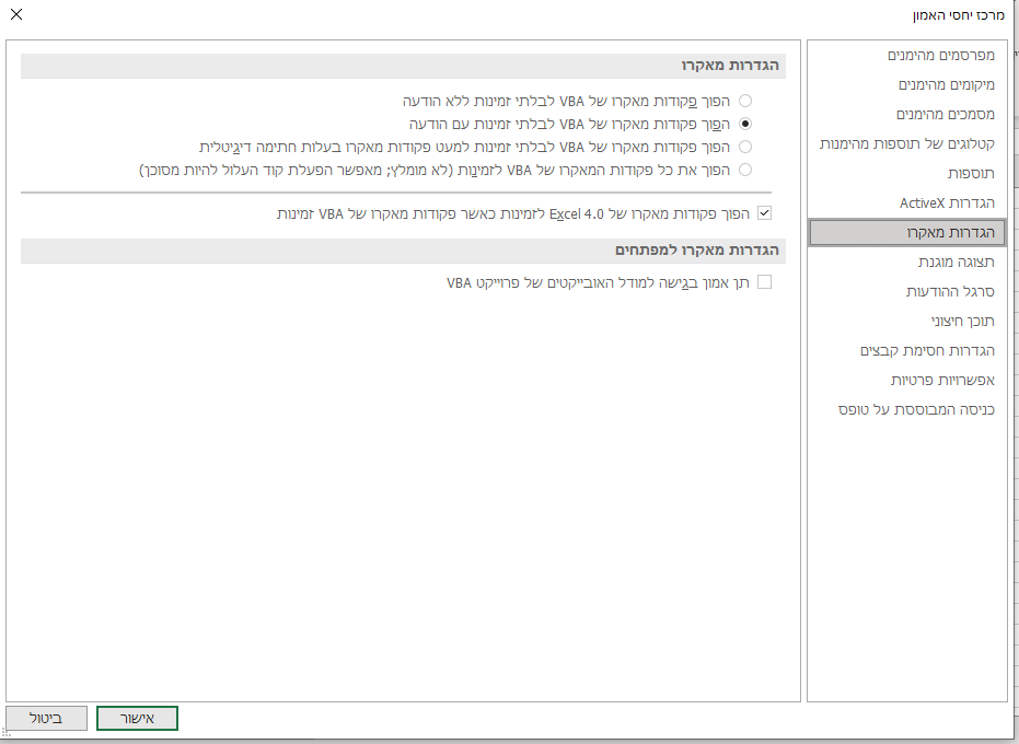 2:השבת את כל פקודות המאקרו עם הודעה: זוהי הגדרת ברירת המחדל, כשתפתחו קובץ עם מאקרו, תופיע אזהרה למעלה.וכדי להריץ את המאקרו נלחץ "אישור"