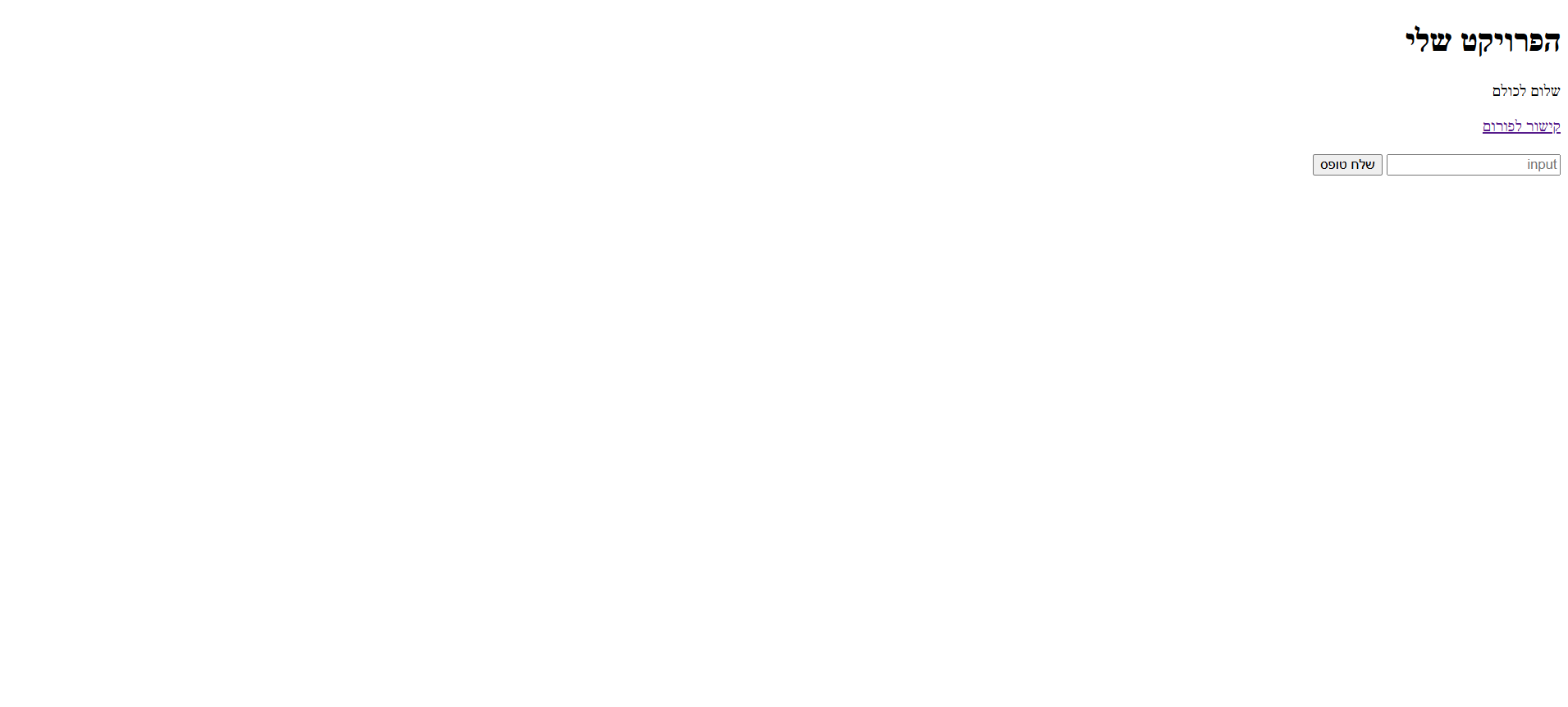 נכניס בקוד שלנו את כל האלמנטים לעיל:<!DOCTYPE html> <html dir="rtl"> <head> </head> <body> <h1>הפרויקט שלי</h1> <p>שלום לכולם</p> <a href="https://mitmachim.top/">קישור לפורום</a> <br> <br> <input type="text" placeholder="input"> <button>שלח טופס</button> </body> </html>תשמרו את השינויים, תרעננו את הדפדפן ותראו את השינויים!