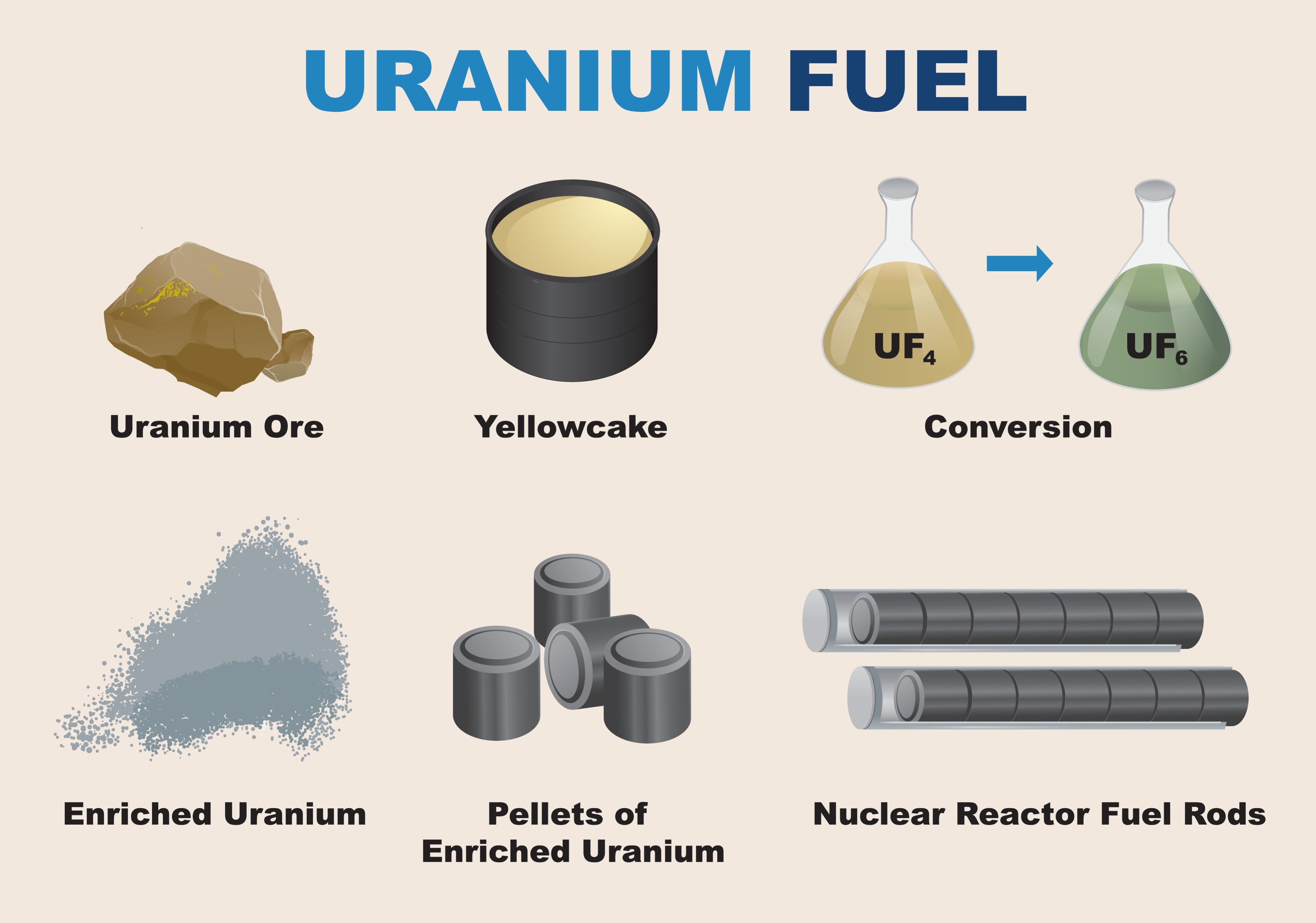 - הכנה להעשרה: אורניום טבעי (yellowcake - U3O8) אחרי טחינתו לאבקה הידועה בשם “עוגה צהובה” – yellowcake, מומר לאורניום הקספלואוריד (UF6, או "hex"), גז שמתאים להעשרה. זה נעשה בתהליך כימי מורכב, כי פלואורין (F) עוזר בהפרדה ללא השפעה על המסה.