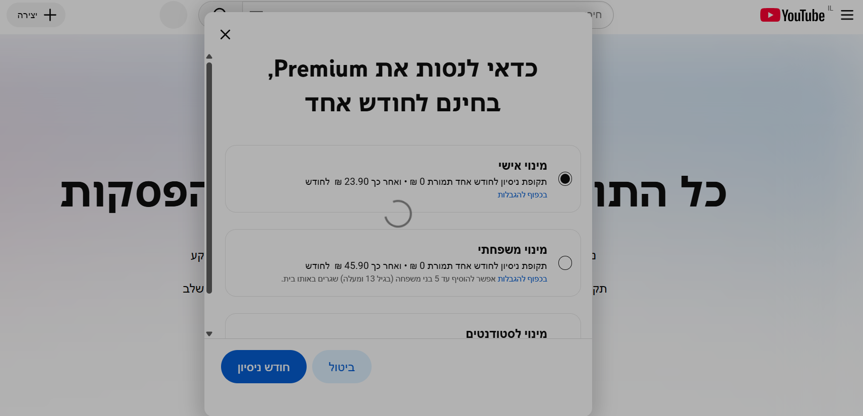 אני מעוניין להצטרף ל'יוטיוב פרימיום'.