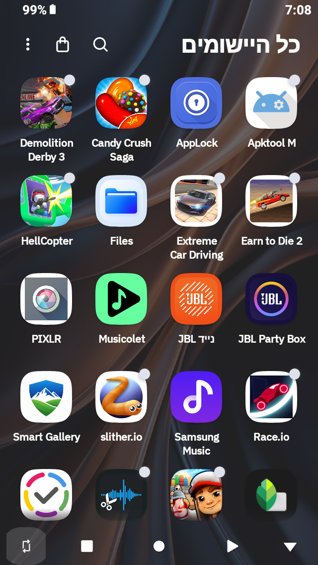 - סדר אוטומטי: מסדר את כל האפליקציות לפי קטגוריות (מוזיקה, כלים, משחקים וכו').