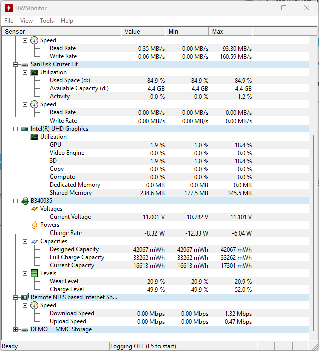 HWMonitor – בדיקת טמפרטורה ובריאות הסוללה.