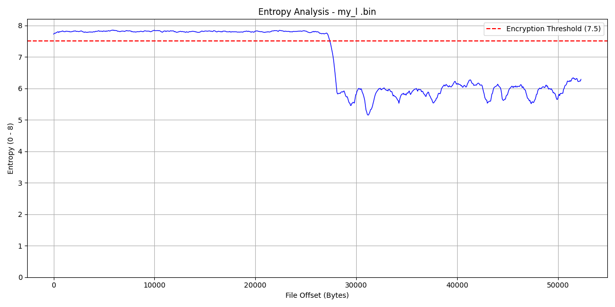 מצורף הקוד שהשתמשתי בוimport math from collections import Counter def calculate_entropy(data_chunk): if not data_chunk: return 0 entropy = 0 length = len(data_chunk) byte_counts = Counter(data_chunk) for count in byte_counts.values(): probability = count / length entropy -= probability * math.log2(probability) return entropy def sliding_window_entropy(file_path, window_size=1024, step_size=64): with open(file_path, 'rb') as f: file_data = f.read() file_size = len(file_data) if file_size < window_size: return None, None positions = [] entropies = [] for i in range(0, file_size - window_size + 1, step_size): window = file_data[i:i + window_size] ent = calculate_entropy(window) positions.append(i) entropies.append(ent) return positions, entropies