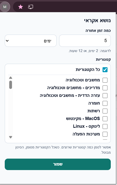 ניתן לבחור כמה זמן אחורה הוא יכול להביא נושא, וגם באילו קטגוריות.