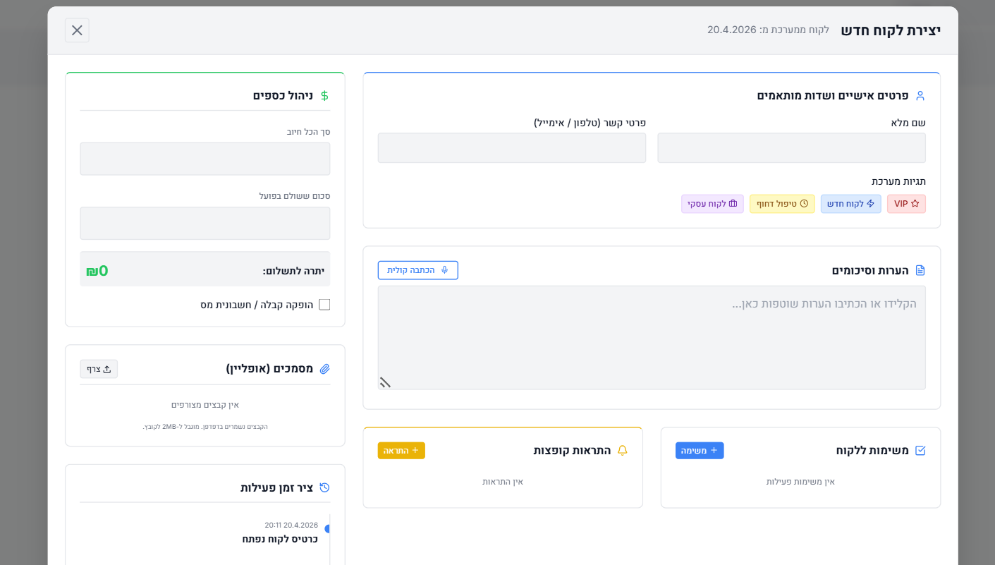 ציר זמן ויזואלי (Audit Timeline): המערכת עוקבת אחרי פעולות חשובות (כמו הוספת תשלום, סיום משימה או הפקת קבלה) ורושמת אותן אוטומטית עם תאריך ושעה בצד שמאל של כרטיס הלקוח.